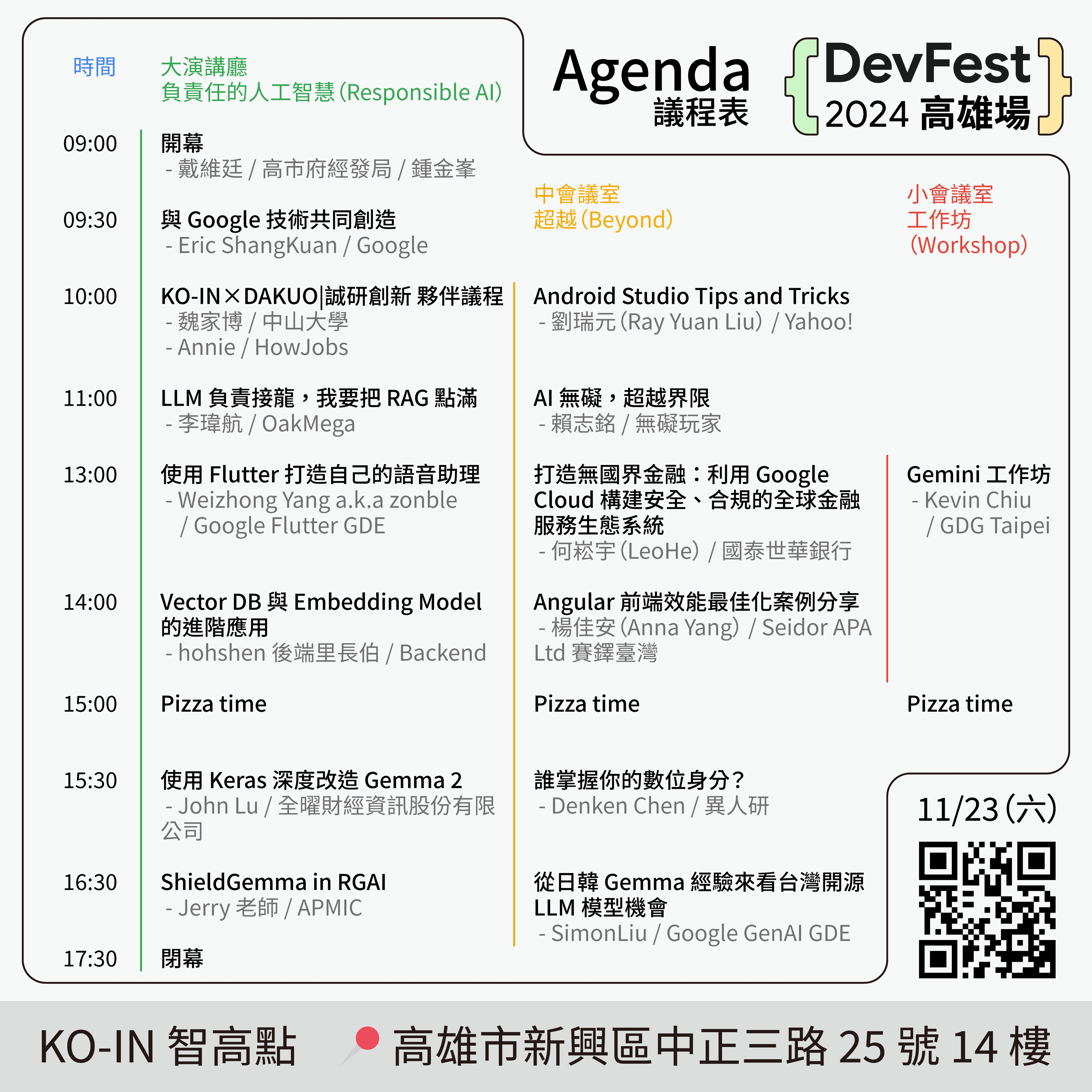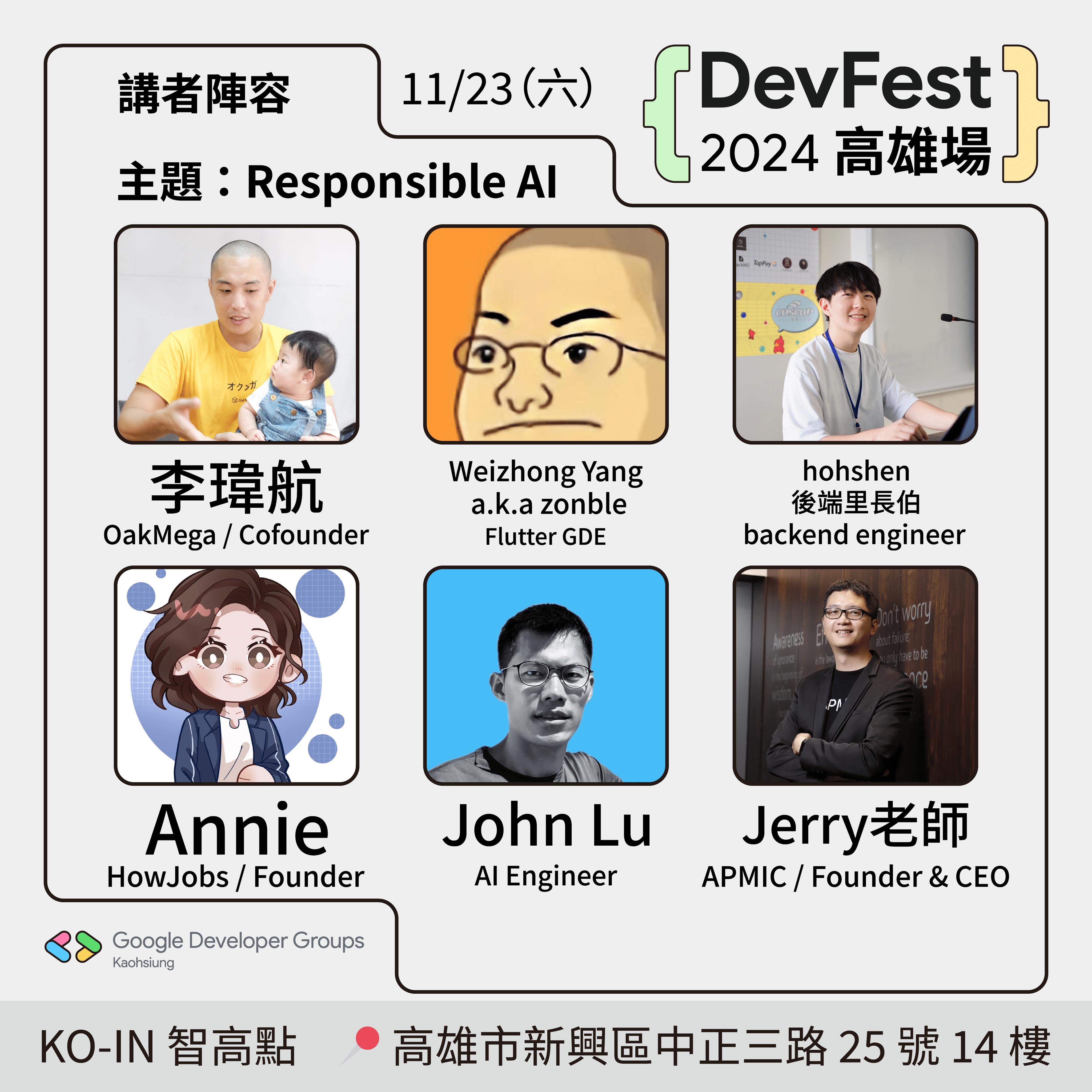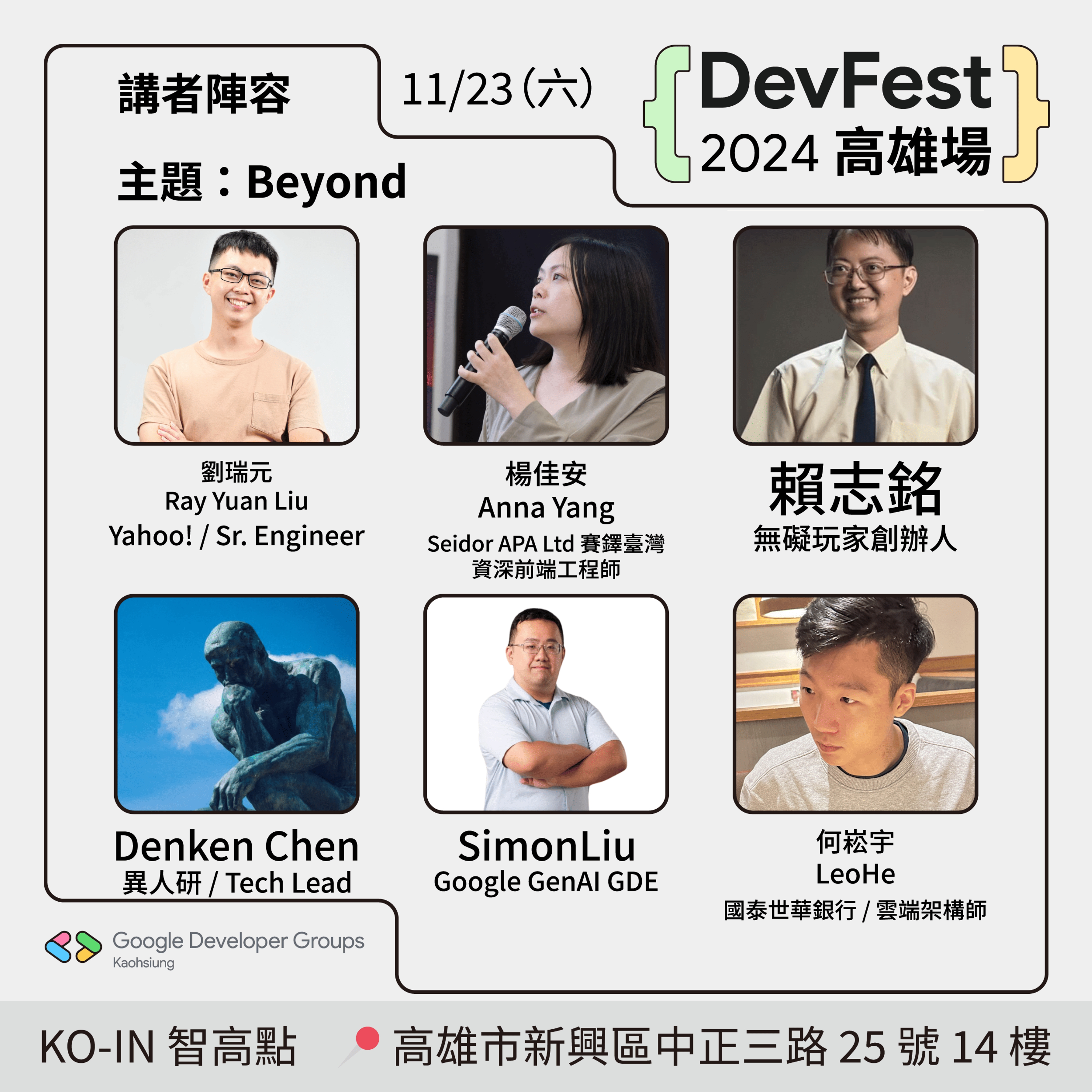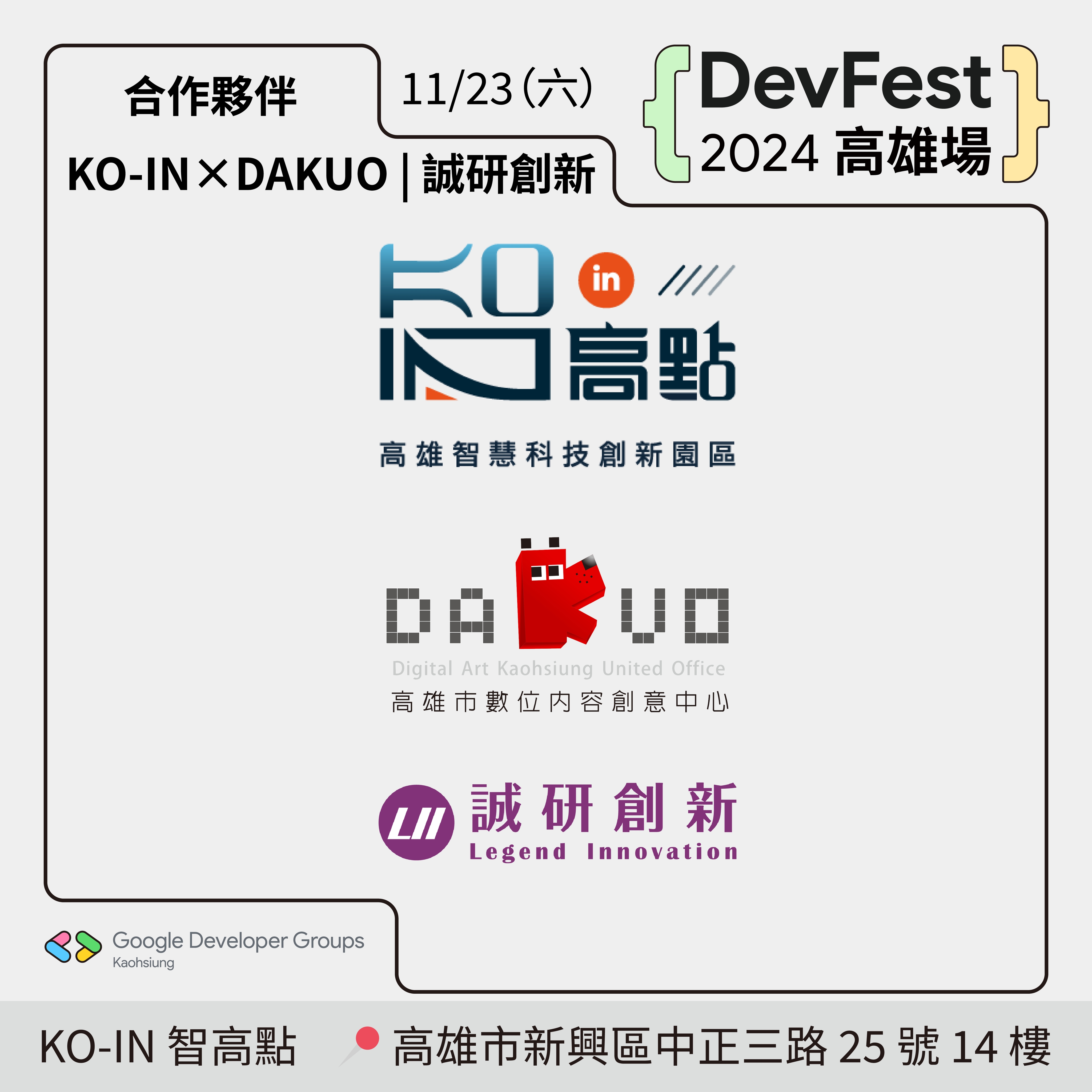 每次辦 DevFest 這種大場面的活動,場地都很難找,感謝 KO-IN×DAKUO | 誠研創新 對 DevFest 2024 高雄場的幫助與支援,KO-IN 智高點和DAKUO數創中心都是很棒的場地,也是高雄軟體社群辦活動的首選。