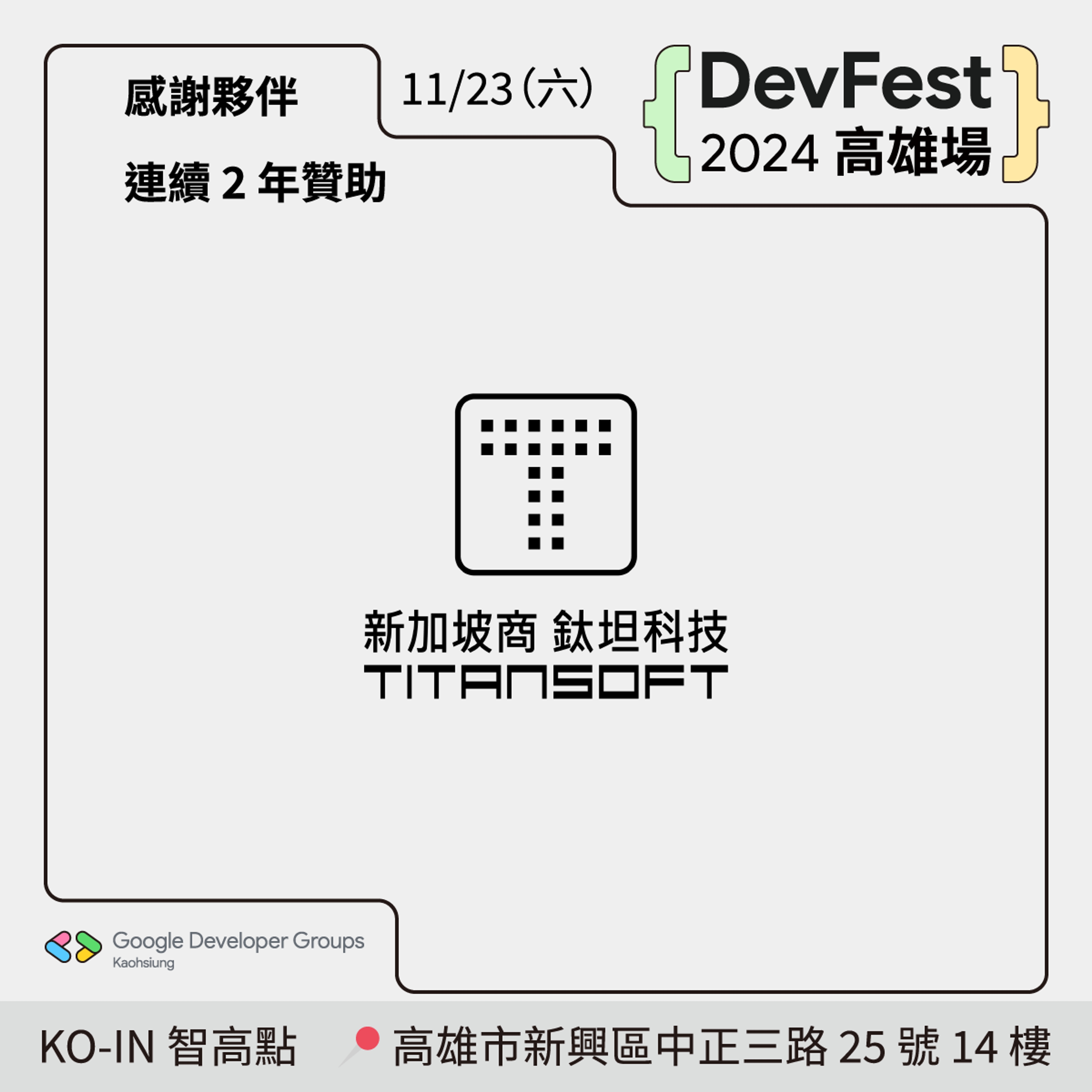新加坡商鈦坦科技已經是連續二年贊助 DevFest 高雄場,再次感謝鈦坦科技對 DevFest 2024 高雄場的鼎力相助,讓我們享受更豐富的內容。